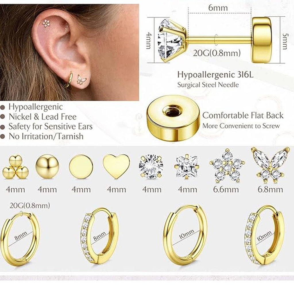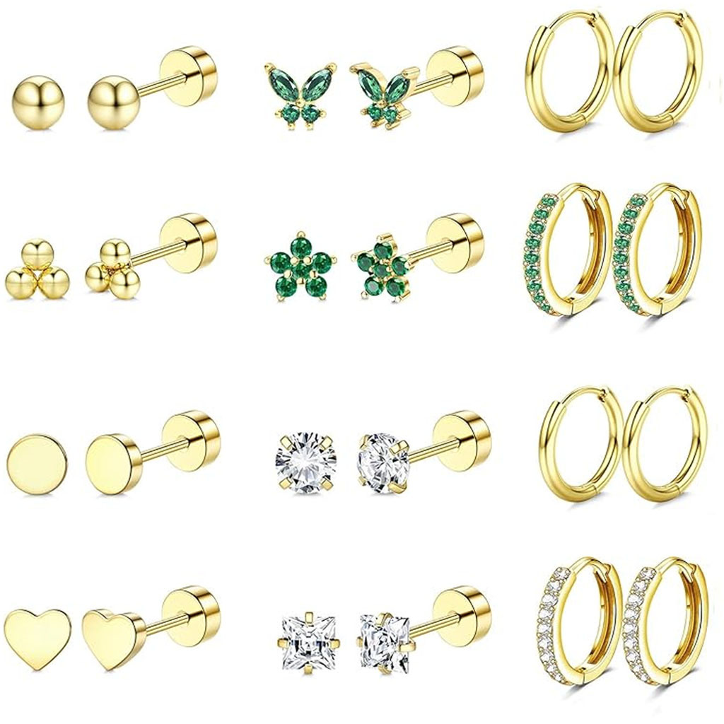 Color: Style 1 in gold (1 set), Style 1 in steel color (1 set), Style 2 in gold (1 set), Style 2 in steel color (1 set), Style 3 in gold (1 set), 9 pairs in steel color, 9 pairs in gold, 9 plain ring pairs in steel color, 11 plain ring pairs in gold, 28-piece set in gold, 28-piece set in silver, 9 plain ring pairs in gold, 28-piece Lightning design in steel color, 28-piece Lightning design in gold.